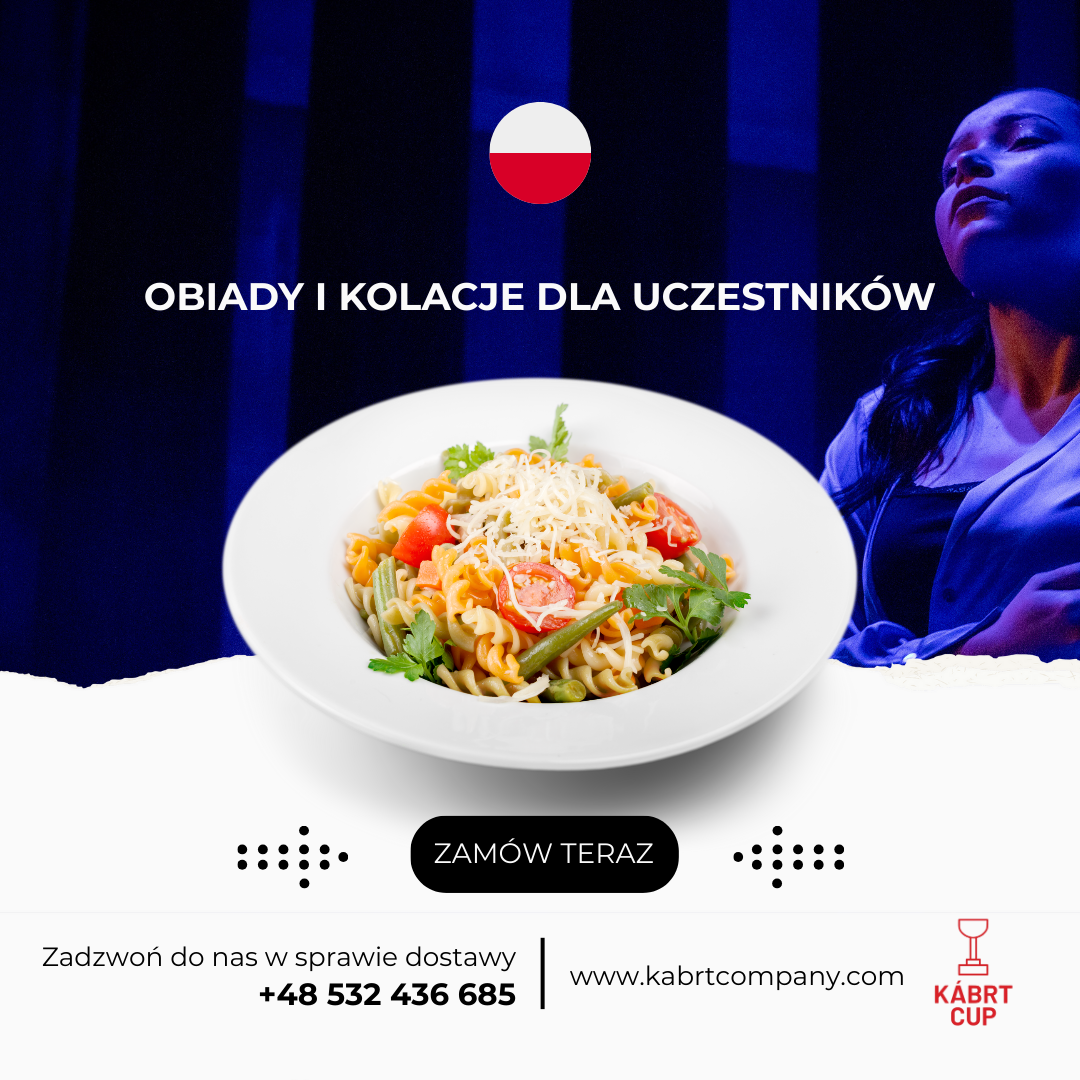 Zabezpiecz wyżywienie bezpośrednio na zawodach. Zamów jedzenie z wyprzedzeniem, aby móc wygodnie i bez problemów zjeść podczas tanecznych zawodów.