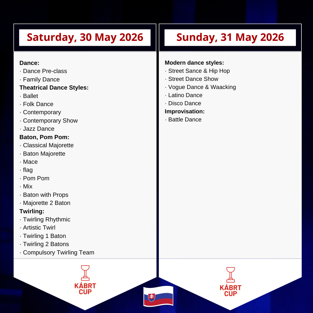 Tanečné disciplíny sú rozdelené do dvoch súťažných dní.